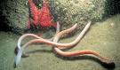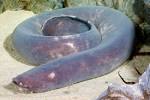 The Atlantic hagfish has been called the nastiest and most disgusting litle creature in the sea. It is more closely related to some primitive creatures such as the lampreys. Hagfish have a long, eel-like body that averages 18 inches (about a half meter) in length, although it is believed that some of them can grow as long as 32 inches (nearly a meter). The hagfish is a scaleless fish with soft skin and thick barbels on the end of its mouth. Hagfish have a partial skull but no vertebrae, so they cannot technically be classified as vertebrates. They have no jaws and no bones. Their skeleton is made up entirely of cartilage. They have very poorly developed eyes located just under the skin and are almost blind. They do, however have finely developed senses of smell and touch which help them find food in the darkness of the deep sea. There are four small sensing tentacles near their mouth. They also have between 5 and 15 pairs of gills. Their colors can range from pink to brown to various shades of gray. Hagfish have a very primitive circulatory system that contains four hearts. One heart, known as the brachial heart, serves as the main pump, while the other three hearts serve as accessory pumps.